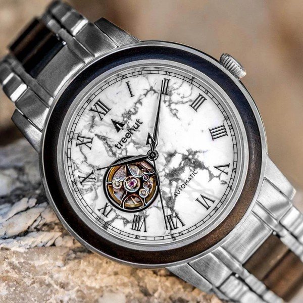 Travel through time with the Atlas Collection - Treehut’s first automatic watch - a combination of elegant style and pure form mechanics for the man who appreciates timeless designs with intelligence and grace. Featuring a real marble dial with a small window revealing the movement, adorned with wood bezel on a vintage inspired barrel-shaped stainless steel case, creating the minimal and versatile everyday watch for the profound well-traveled man.
