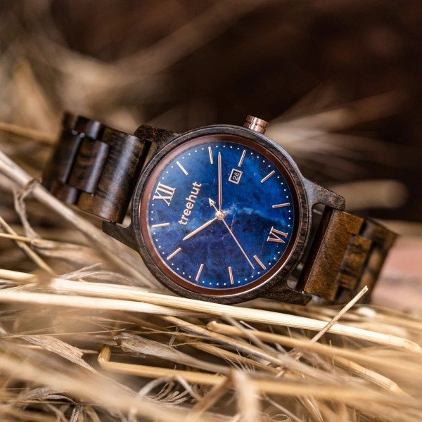 The Odyssey Marble Ebony Rose Gold men's watch is made of natural ebony wood. The dial, which includes a date indicator, is cut from the finest Italian blue marble and detailed with rose gold markings and Roman numerals at 6 and 12 o'clock and accented with rose gold hands.