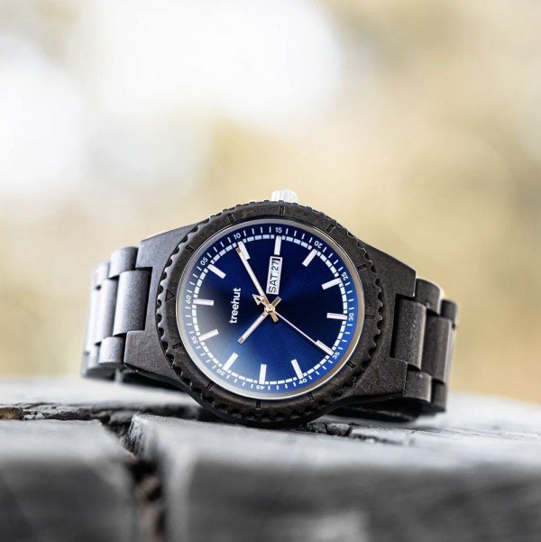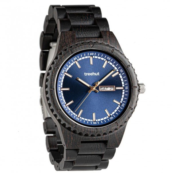 Classic Collection is the very heart of the Treehut brand and will never disappoint. Classic Day-Date is inspired by exploring, being out of bounds and the mechanics of moving parts that gets you to the next stop of your adventure. It features a gear shaped bezel, useful day-date function, dimensional dial constructs, slim rose gold luminous hour markers and hands for better visibility in dim lit conditions. The case of this Classic Day-Date Ebony Blue Rosegold watch is made from ebony wood, producing in a light weight everyday adventure piece.