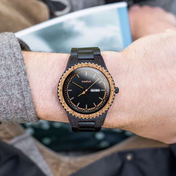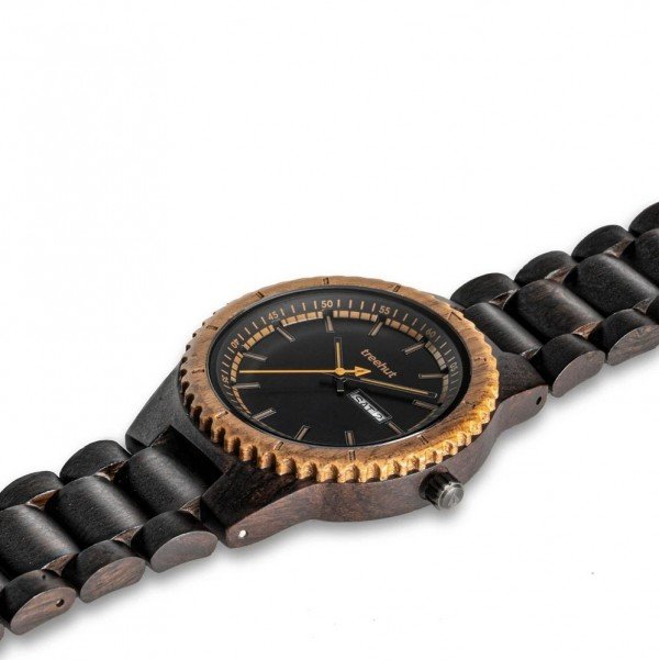 Classic Collection is the very heart of the Treehut brand and will never disappoint. Classic Day-Date is inspired by exploring, being out of bounds and the mechanics of moving parts that gets you to the next stop of your adventure. It features an impressive double layered wood case with walnut and ebony, useful day-date function, dimensional dial constructs, slim matching hour markers and hands. The case of this Classic Day-Date Ebony Walnut watch is made from ebony wood and walnut wood, producing in a light weight everyday adventure piece.