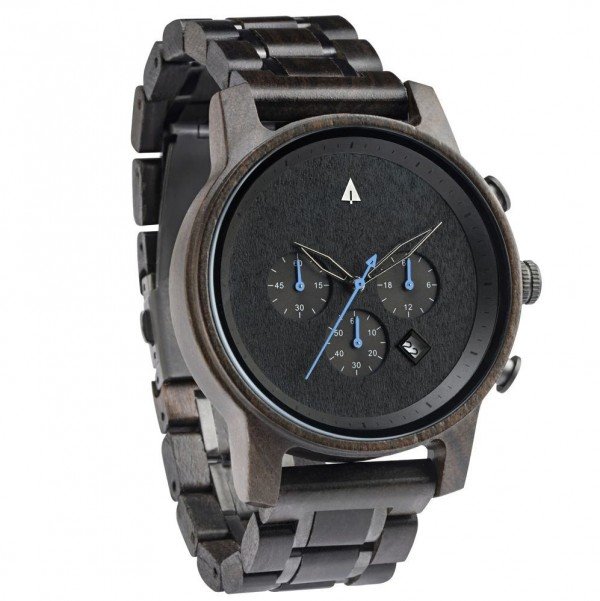 The North Black Ebony Blue features a rich ebony wood dial with blue hands, case and matching ebony band reinforced by gunmetal stainless steel. Classic chronograph details and rustic textures pair with sleek lines in the band's interlinking pattern. Lightweight for everyday wear.