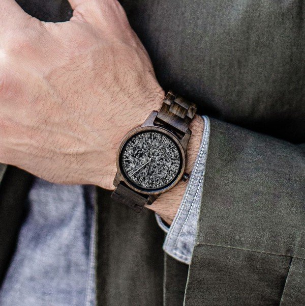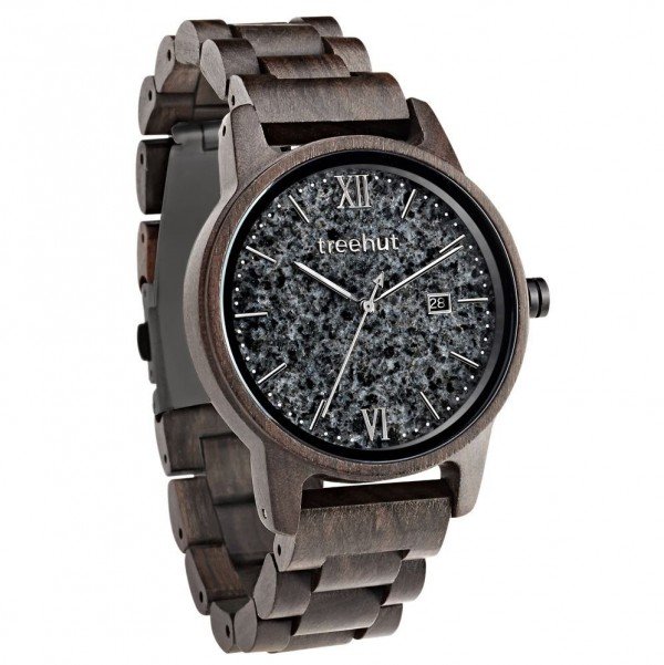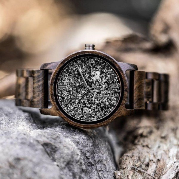 The Odyssey Ebony Stone men's watch is made of natural ebony wood. The dial, which includes a date indicator, is cut from the finest Italian grey speckled marble and detailed with sliver markings and Roman numerals at 6 and 12 o'clock.