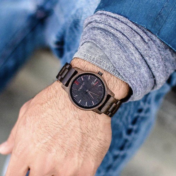 The Odyssey All Ebony Red men's watch is made of natural ebony wood. The dial, which includes a date indicator, is cut from natural ebony wood and detailed with sliver markings and a red 12 o'clock Roman numeral, accented with silver hands and a two toned black and red seconds hand for a subtle pop of color.