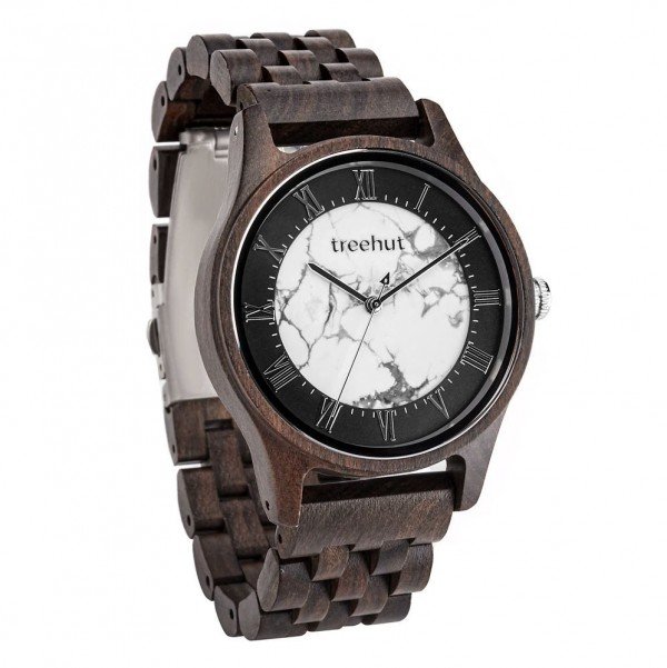 Sojourn Ebony White Marble mens watch is made with natural ebony wood. Designed with a natural white marble dial layered with a stainless steel ring detailed with Roman numeral markings and accented with silver hands.