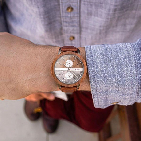 Tao Marble Cognac Leather men's watch combines real grey marble and natural walnut wood to create a dual dial construction encased in a layered walnut wood and gunmetal stainless steel case. Detailed with two vertically places sub-dials indicating 24-hour military time and date, a silver bar at the center, silver bar markings, and mountain index hands. Paired with a tan genuine leather band.