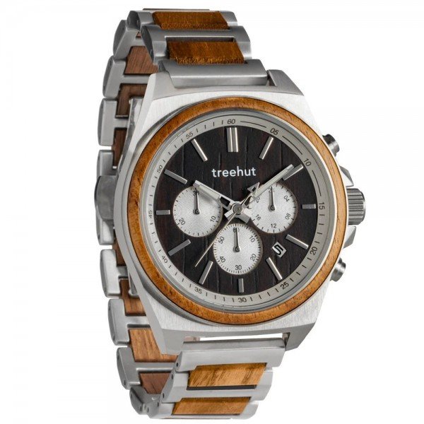 Aster Koa Wood Stainless Steel chronograph men's watch features a natural ebony wood dial, detailed with minimal silver bar markings and reftective hands, encased in a silver stainless steel case with a Hawaiian koa wood inlay and paired perfectly with a matching three-link band.