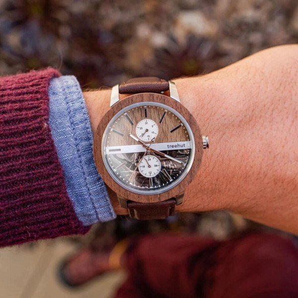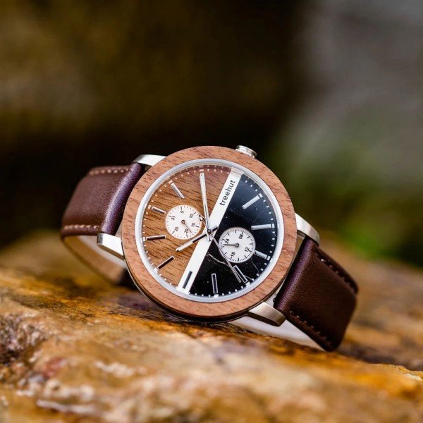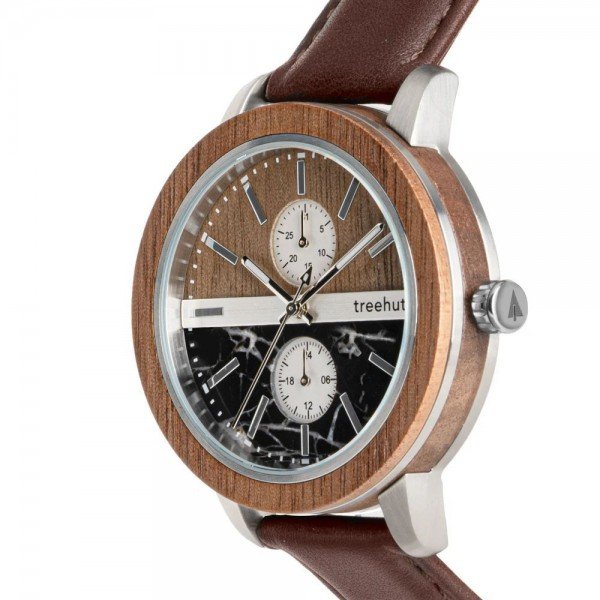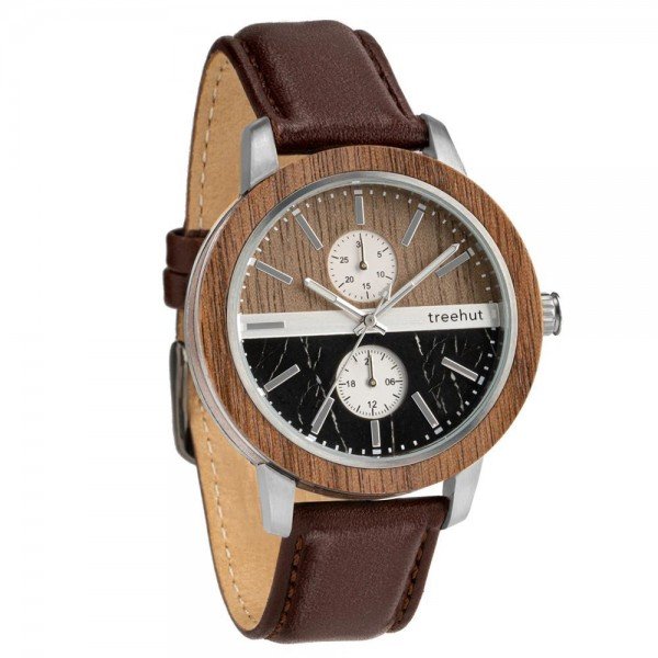 Tao Black Marble Brown Leather men's watch combines real black marble and natural walnut wood to create a dual dial construction encased in a layered walnut wood and silver stainless steel case. Detailed with two vertically places sub-dials indicating 24-hour military time and date, a silver bar at the center, silver bar markings, and mountain index hands. Paired with high quality padded brown leather band.