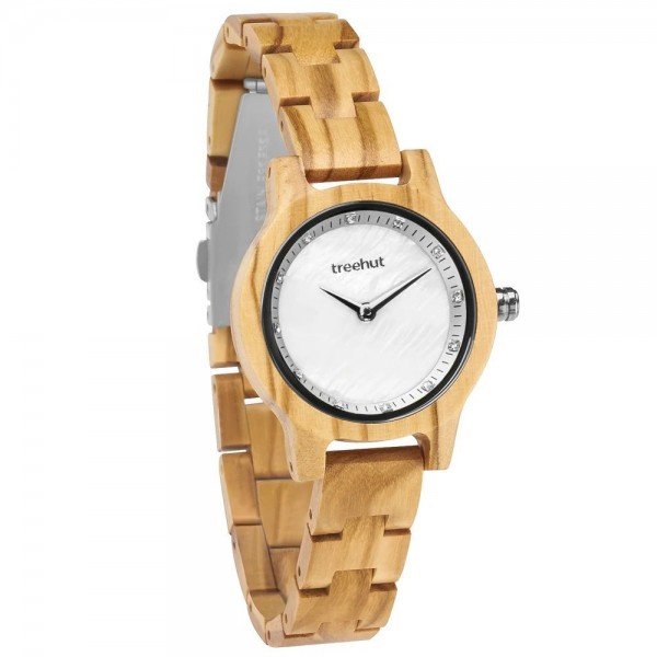 The Pearl Petite Olive Frost features an iridescent white mother of pearl dial detailed with white diamonds as numbers, framed with an elegantly minimal case and band made from all natural olive wood.
