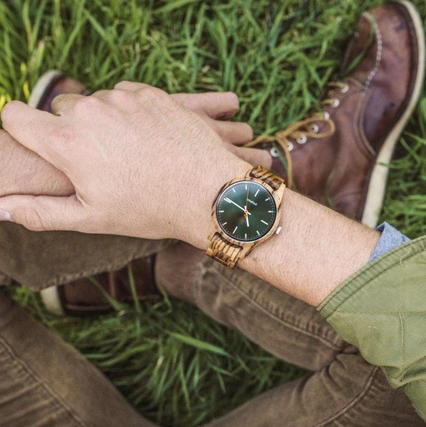 Dubline Zebrawood Green mens watch is made with natural zebrawood. Designed with a green sun ray dial detailed with silver glow-in-the-dark hourly markings and hands.