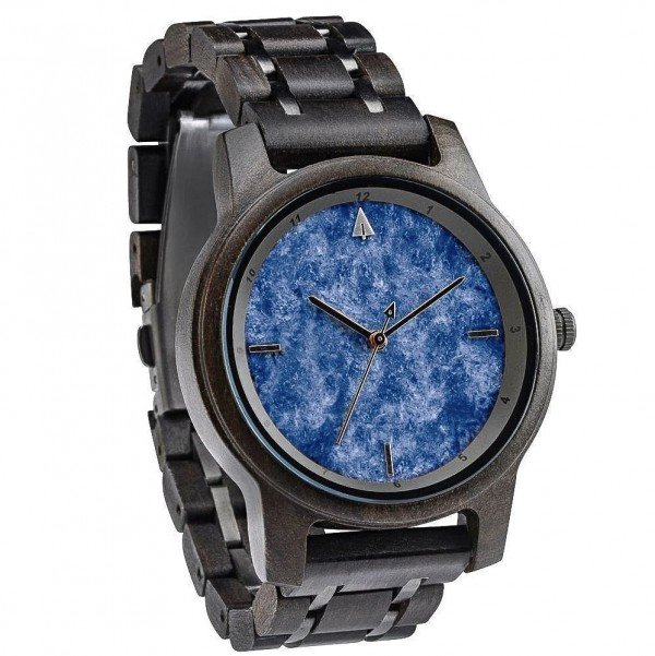 The Horizon Ebony Blue Marble men's watch features a blue marble dial, rich ebony case and matching ebony wood band reinforced by gunmetal stainless steel. Minimalist stone dial unique to its kind and band with sleek interlinking pattern. Lightweight for everyday wear.
