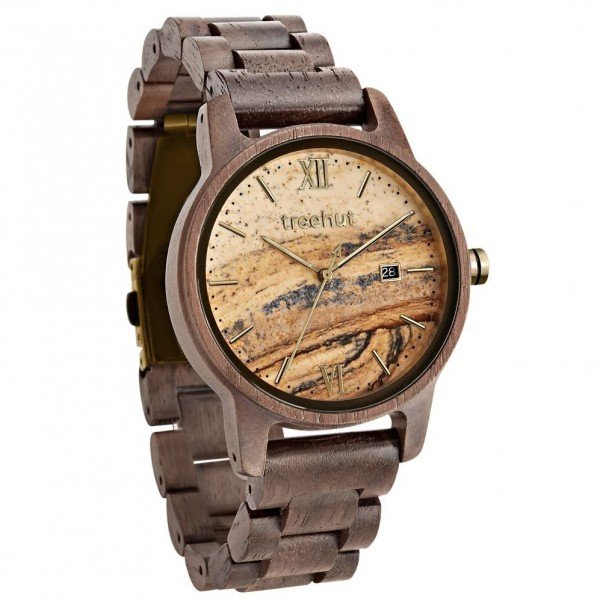 The Odyssey Sandstone Walnut Copper men's watch is made of natural walnut wood. The dial, which includes a date indicator, is cut from the finest Italian marble and detailed with copper markings and Roman numerals at 6 and 12 o'clock and accented with copper hands.