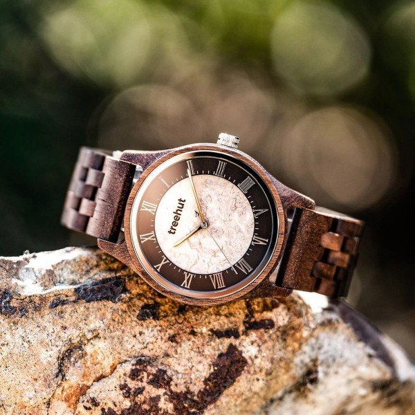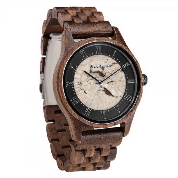 For the man at ease anywhere in the world, wherever they may be going or wherever they’ve arrived. The Sojourn Collection is effortless with modern but bold confidence. Diverse styling makes it an everyday watch for the most eclectic of wearers. Constructed with an all-wood case, 5-link wood band, a real marble dial detailed with a stainless steel ring and combined with striking Roman numerals or bar markings create a unique layered look. Textured and balanced, like the wearer of this timepiece.