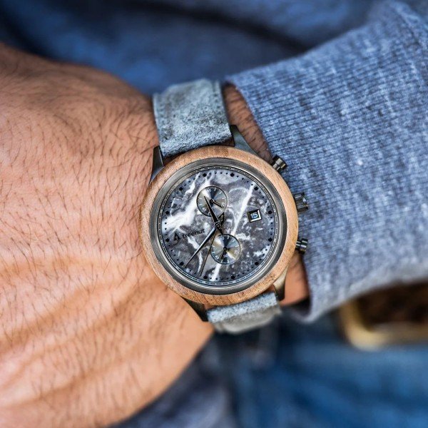 Experience new heights with Treehut’s Rise Collection. A watch ideal for the one that stands up and shows up. Subtle yet sophisticated with bold contrasts. Its minimal dot markings and two vertically placed small dials on a real marble dial symbolize the movement of the moon and the sun in our daily rituals. Created and designed for the man living in the NOW.