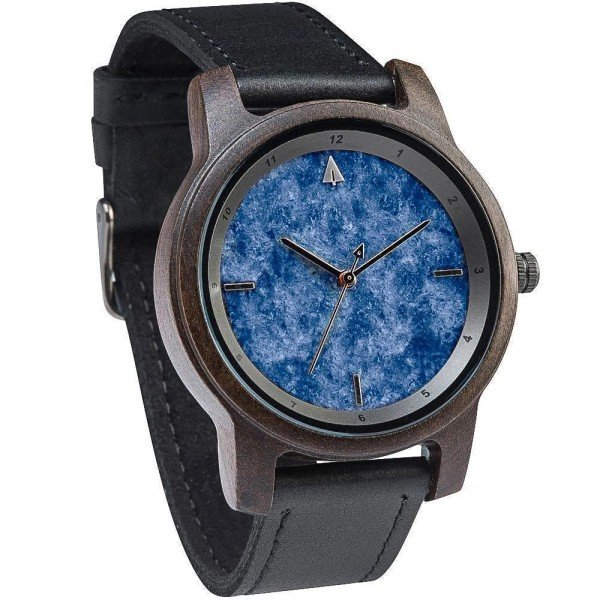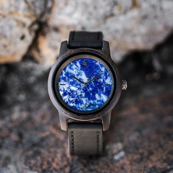 The Horizon Blue Marble Ebony Black men's watch features a blue marble dial, rich ebony case and genuine leather band. Minimalist stone dial unique to its kind. Lightweight for everyday wear.