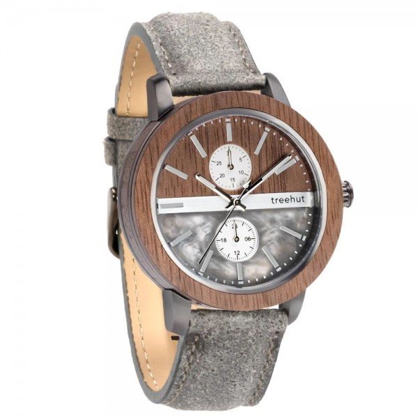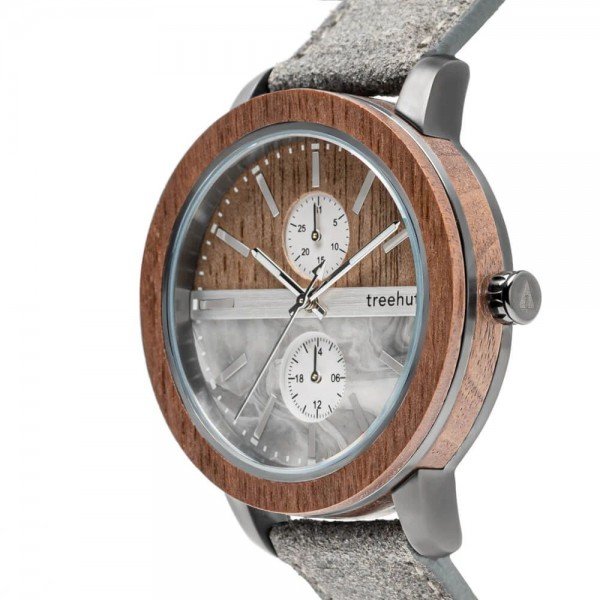 Tao Marble Vintage Grey men's watch combines real grey marble and natural walnut wood to create a dual dial construction encased in a layered walnut wood and gunmetal stainless steel case. Detailed with two vertically places sub-dials indicating 24-hour military time and date, a silver bar at the center, silver bar markings, and mountain index hands. Paired with a grey genuine leather band.