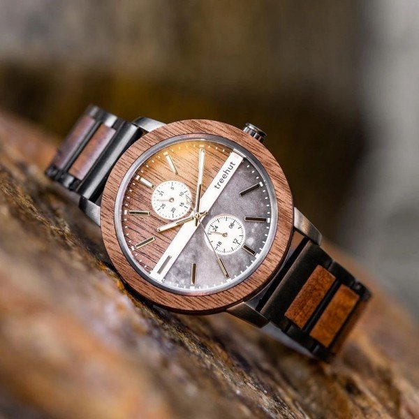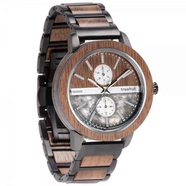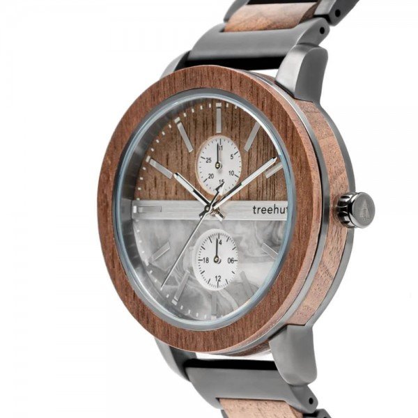 Tao Grey Marble Walnut men's watch combines real grey marble and natural walnut wood to create a dual dial construction encased in a layered walnut wood and gunmetal stainless steel case. Detailed with two vertically places sub-dials indicating 24-hour military time and date, a silver bar at the center, silver bar markings, and mountain index hands. Paired with a three-link gunmetal stainless steel and walnut wood band.