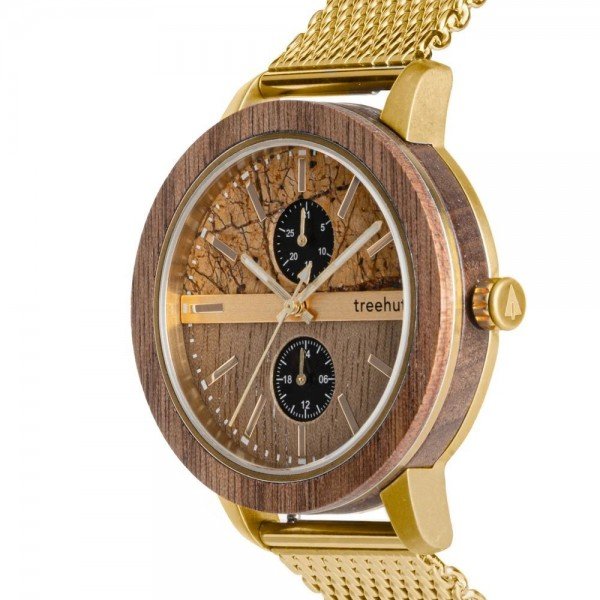 Tao Sandstone Patina Gold men's watch combines real marble and natural walnut wood to create a dual dial construction encased in a layered walnut wood and patina gold stainless steel case. Detailed with two vertically places sub-dials indicating 24-hour military time and date, a gold bar at the center, gold bar markings, and mountain index hands. Paired with a gold mesh band.