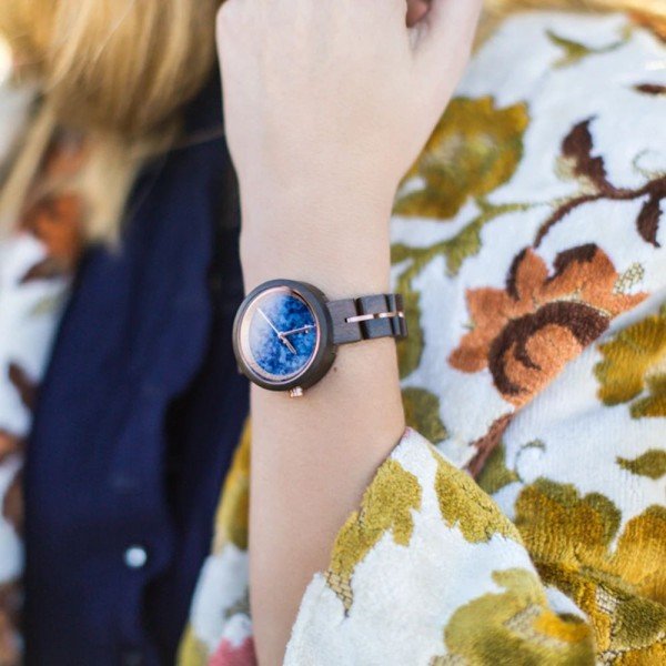 The Theory Rose Ebony Blue Marble women's watch features a blue marble dial framed in ebony wood. Minimalist stone dial unique to its kind. Ebony band accented by rose gold stainless steel. Lightweight for everyday wear.