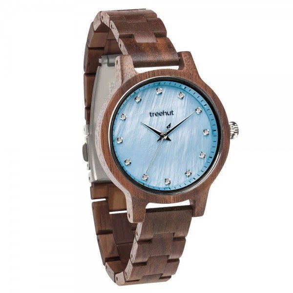 Emma Walnut Sky, iridescent gold-toned mother-of-pearl dial accented with white diamond numerals. Minimalist design framed gracefully in all natural rich chocolate walnut wood case and band. All mother-of-pearl dials are unique pieces, full of mystery and surprises in different lights.