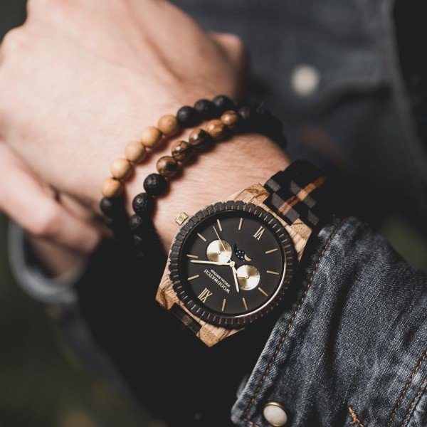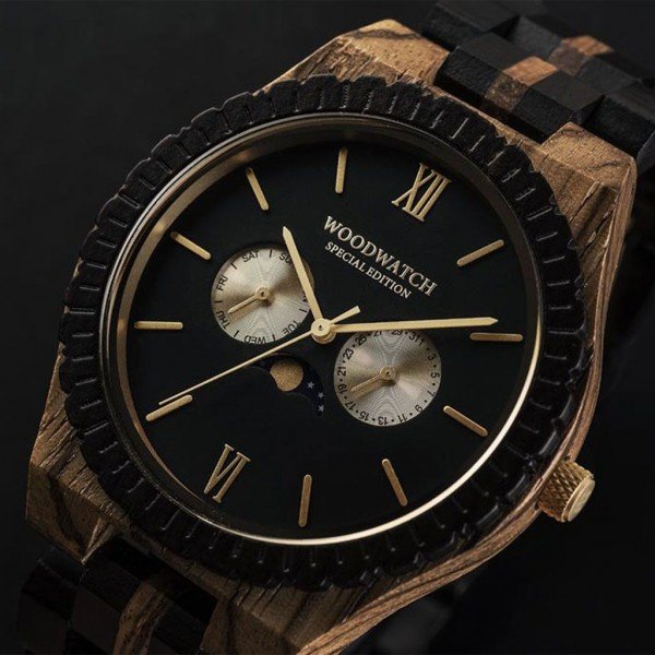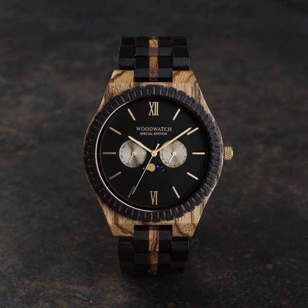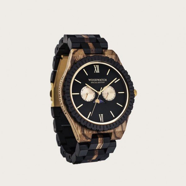 This premium designed watch combines natural wood type with a luxurious stainless steel dial and backplate. At the heart of the timepiece is a multi-function movement with two subdials featuring a week and month display. The GRAND Nightowl is made of Wenge Wood from Eastern Africa and has a black dial with golden details.