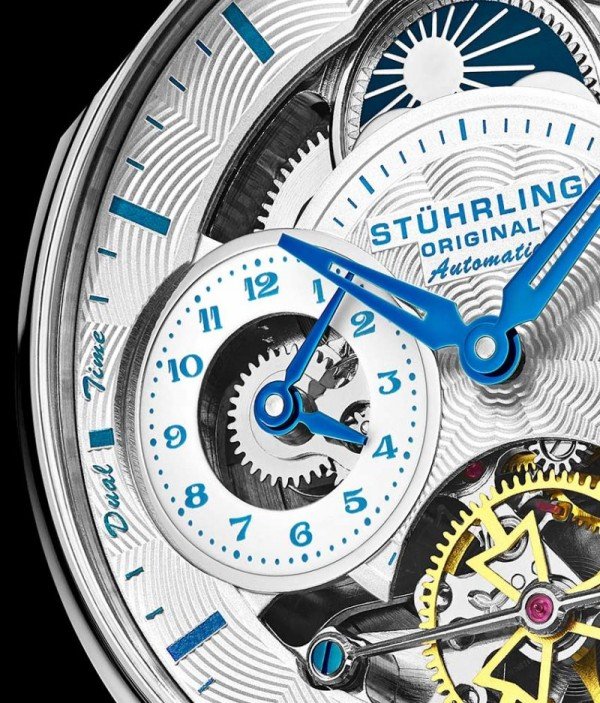 Stunning guilloché work blends seamlessly with an animated AM/PM indicator and a second time-zone subdial to create an eye-catching dial.
