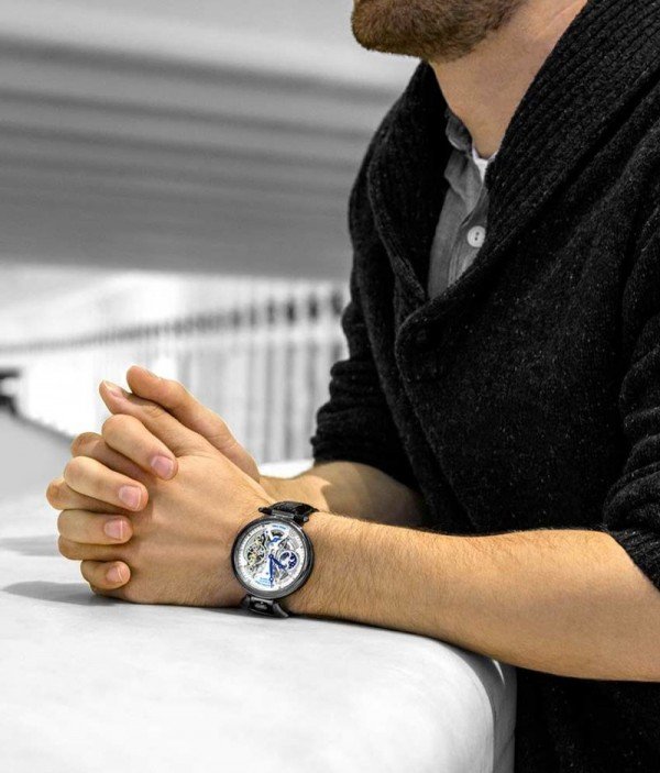 The animated AM/PM indicator and second time-zone subdial pair perfectly against the textured dial, with an onion crown and crown guard at 12 o’clock to complete the experience.
