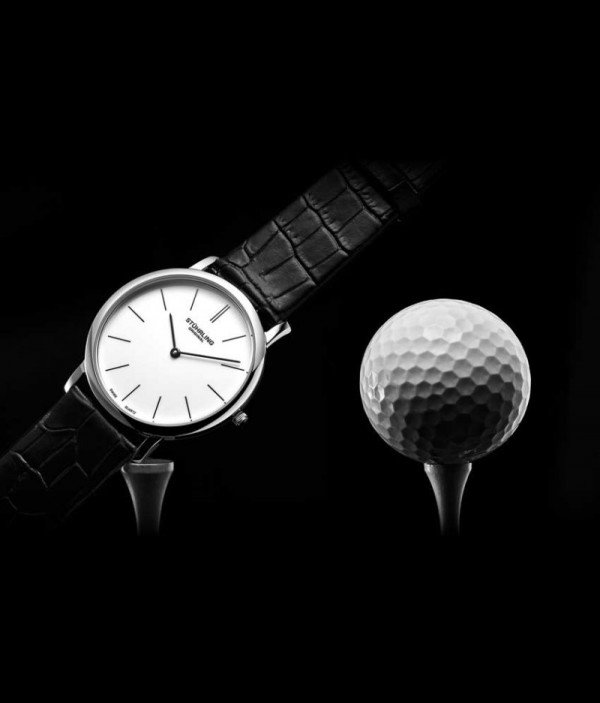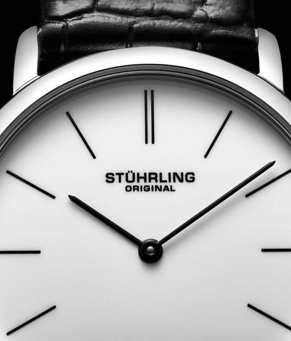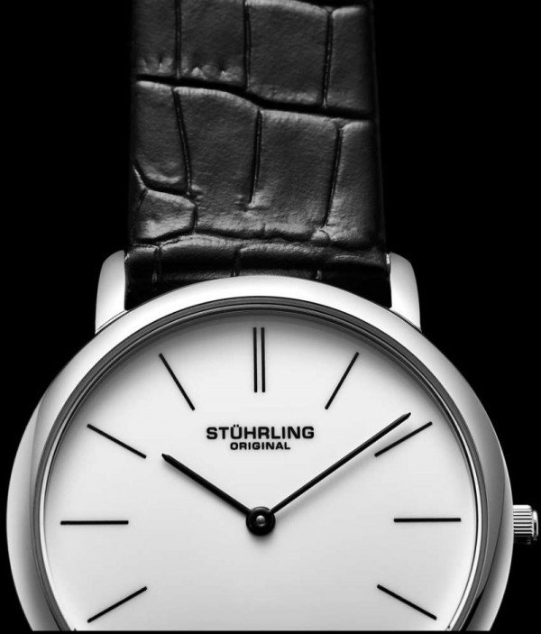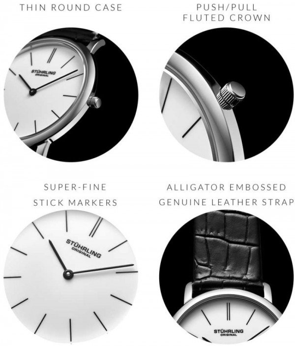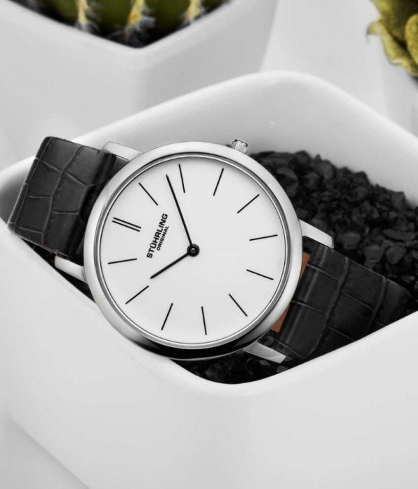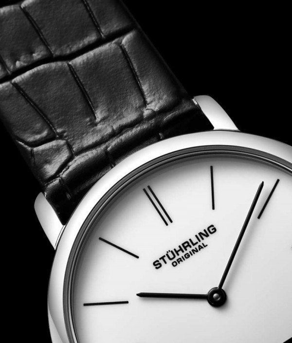 Stainless Steel Case on Black Alligator Embossed Genuine Leather Strap, White Dial, with Black Accents