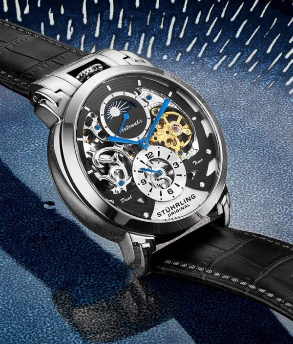 The skeletonized dial with second-time zone and AM/PM indicator subdials craft a bold display that leaps off the wrist.