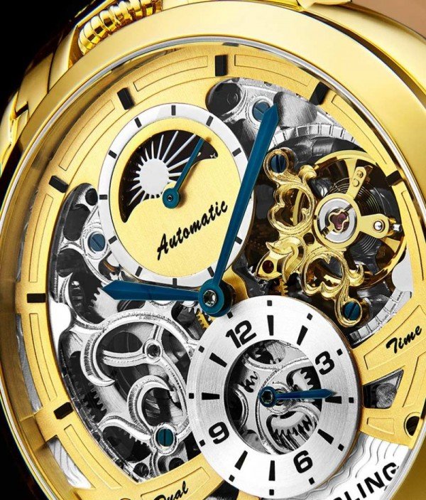 The skeletonized dial with second-time zone and AM/PM indicator subdials craft a bold display that leaps off the wrist.