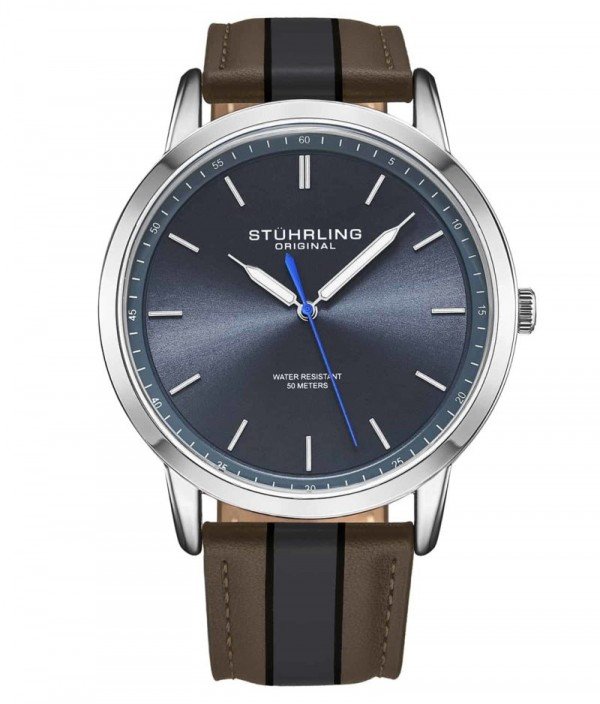 Men’s Quartz Silver Case, Blue Dial with Yellow Accents, Luminous Silver Hands, Silver Markers, TT Dark Brown and Blue Striped Leather Strap Watch