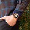 Tao Black Marble Brown Leather men's watch combines real black marble and natural walnut wood to create a dual dial construction encased in a layered walnut wood and silver stainless steel case. Detailed with two vertically places sub-dials indicating 24-hour military time and date, a silver bar at the center, silver bar markings, and mountain index hands. Paired with high quality padded brown leather band.