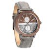 Tao Marble Vintage Grey men's watch combines real grey marble and natural walnut wood to create a dual dial construction encased in a layered walnut wood and gunmetal stainless steel case. Detailed with two vertically places sub-dials indicating 24-hour military time and date, a silver bar at the center, silver bar markings, and mountain index hands. Paired with a grey genuine leather band.