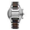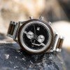 The Rise Ebony Black Marble men's watch features a black marble dial with a date indicator, silver minimal dot markings, and silver alpha type hands, placed inside a natural ebony wood set bezel and accented with a three link silver stainless steel and ebony wood band.