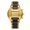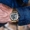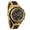 The Rise Ebony Marble Gold men's watch features a taupe marble dial with a date indicator, gold minimal dot markings, and gold alpha type hands, placed inside a natural ebony wood set bezel and accented with a three link gold and ebony wood band.