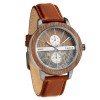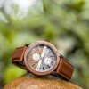 Tao Marble Cognac Leather men's watch combines real grey marble and natural walnut wood to create a dual dial construction encased in a layered walnut wood and gunmetal stainless steel case. Detailed with two vertically places sub-dials indicating 24-hour military time and date, a silver bar at the center, silver bar markings, and mountain index hands. Paired with a tan genuine leather band.